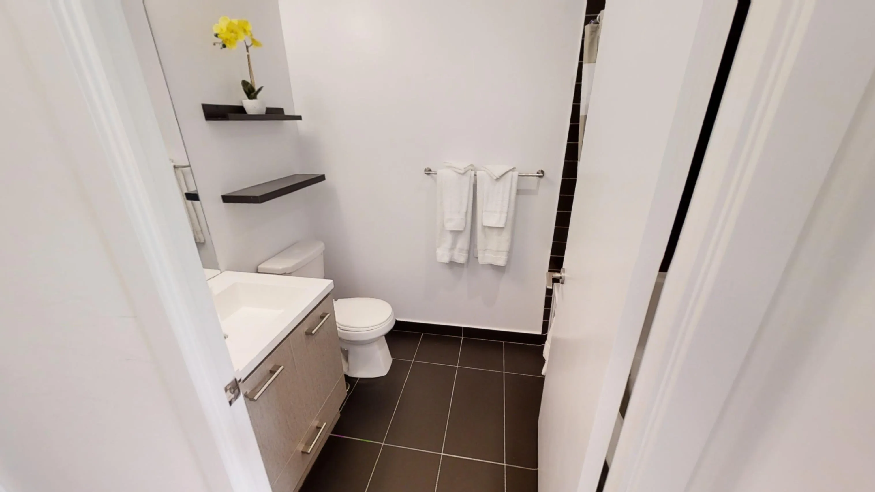 This one bedroom furnished suite is everything that one would need in Toronto Downtown. With a focus on the living room and kitchen, one could access everything in the suite from the center room. Curl up in front of the flat screen TV and enjoy unlimited access to cable or watch a movie with the smart TV provided for guest use. There is also an elongated glass table for those who are looking to get some work done during their stay. This living space also permits access to a private balcony. The suite has a fully furnished kitchen with granite countertops. Guests will have all essential utensils provided to the point where the experience is just as if they were in their own kitchen. The kitchen offers key features with its stainless steel appliances, including a full-sized fridge, stove, sink, and micro-wave.